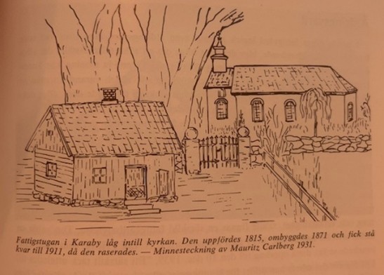 De som bodde i fattigstugorna fick sköta sig själva och ta hand om varandra i mån av förmåga. Ibland fick de från boende i socknen eller så fick de gå runt och tigga. Fattighuset i Karaby vid kyrkan fanns där sedan början av 1815, men efter några år blev det så dåligt att den behövde byggas om 1871. Den fanns kvar tills 1911.