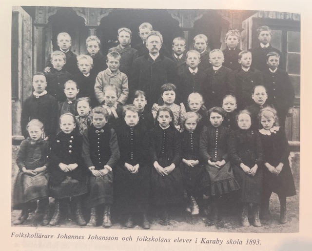 Detta är ett skolfoto från Karaby 1893. Det är möjligt att Berta finns med, då var hon 7 år gammal.